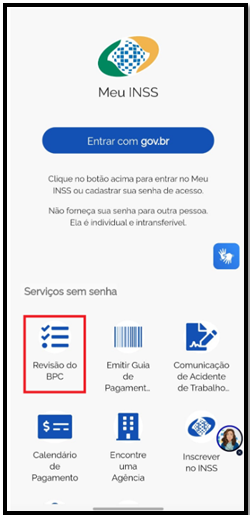 - Encontre na seção Serviços sem senha a opção Revisão do BPC (conforme mostrado na imagem abaixo) e clique nela